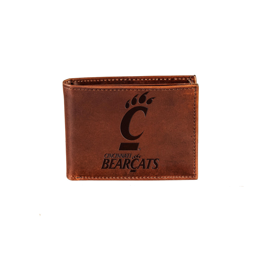 Show your Bearcats pride with this University of Cincinnati bi-fold wallet, crafted from 100% genuine leather in a rich brown hue.