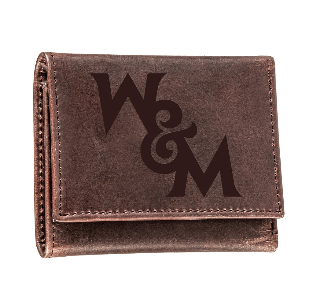 This tri-fold wallet features a sophisticated design with the William & Mary logo, crafted from 100% genuine leather in a rich brown color.