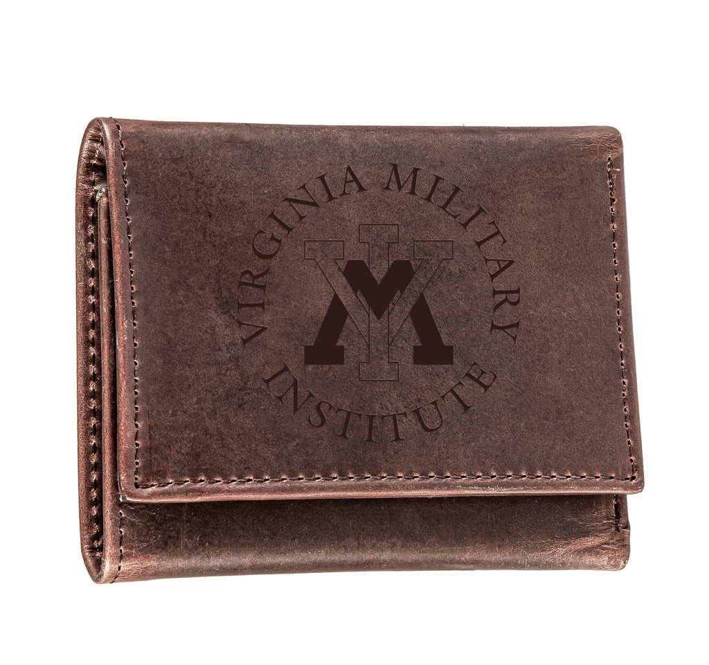 This Virginia Military Institute tri-fold wallet is crafted from 100% genuine leather, offering a durable and sophisticated accessory. Its compact size fits comfortably in pockets while showcasing the VMI logo, making it a perfect gift for university enthusiasts.