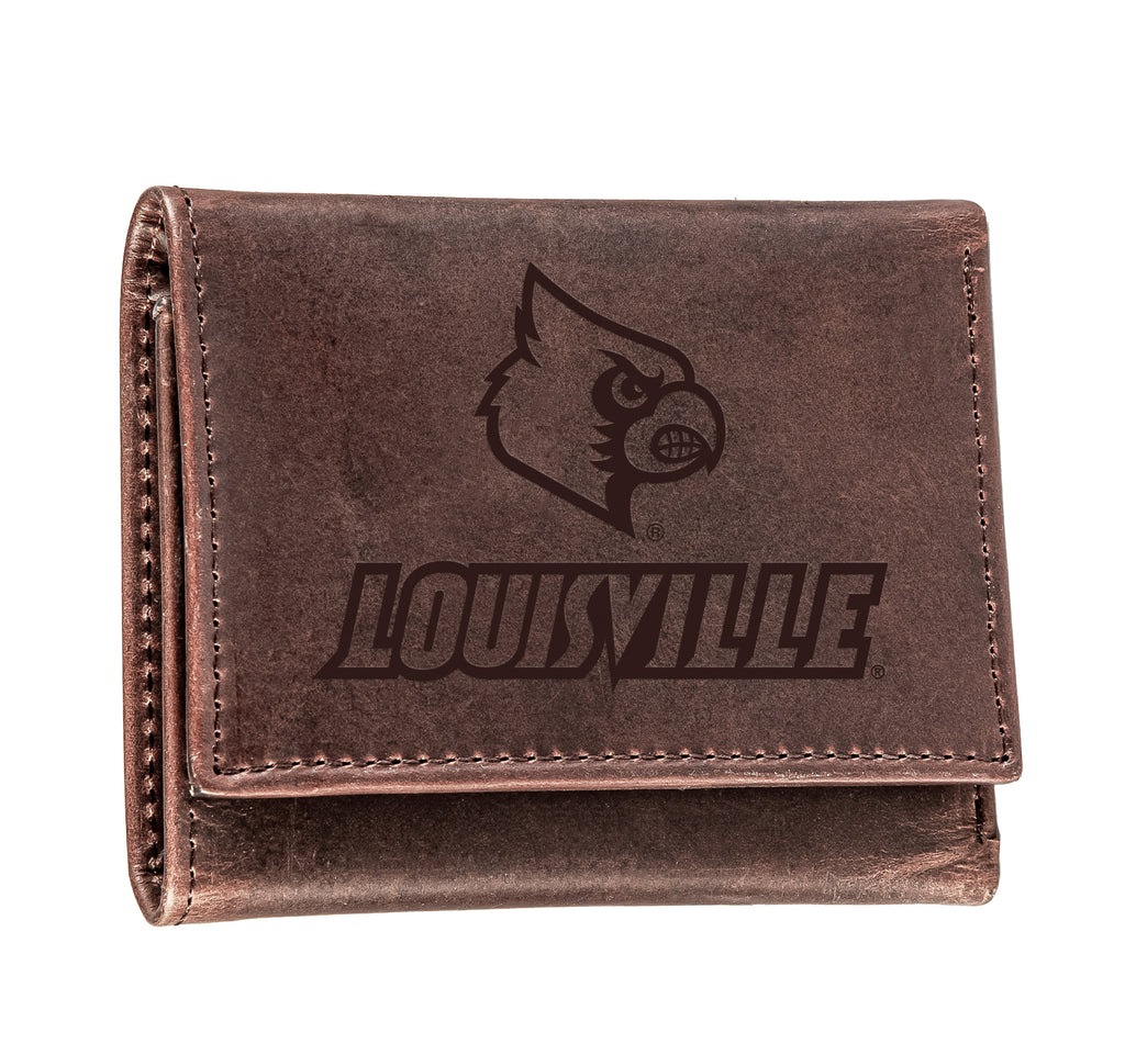 Show your loyalty with this University of Louisville tri-fold wallet, crafted from 100% genuine leather. Its compact size fits perfectly in any pocket.
