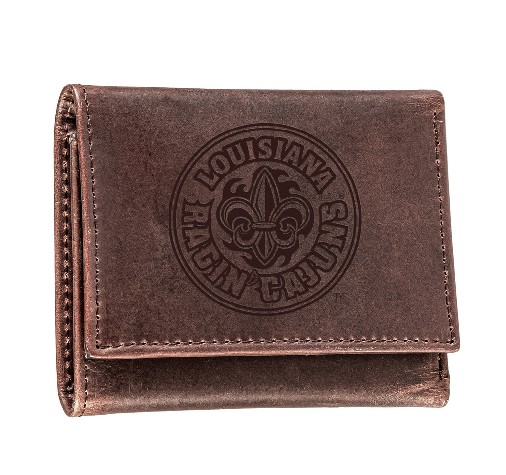 Show off your school spirit with this University of Louisiana at Lafayette tri-fold wallet, crafted from 100% genuine leather in a classic brown hue.