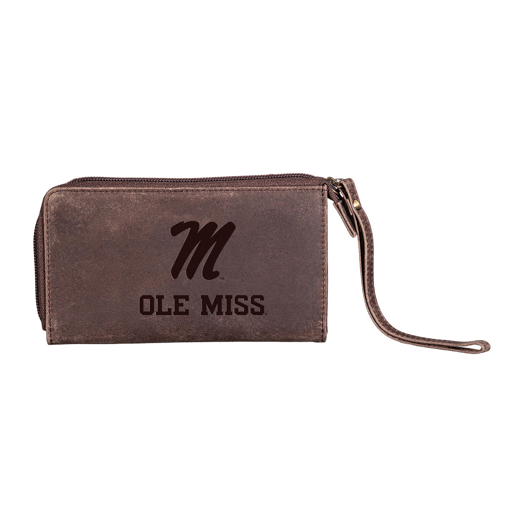 Showcase your school spirit with this University of Mississippi wristlet wallet, perfect for any Ole Miss fan. Crafted in a rich brown hue, this wallet combines functionality with elegant design.