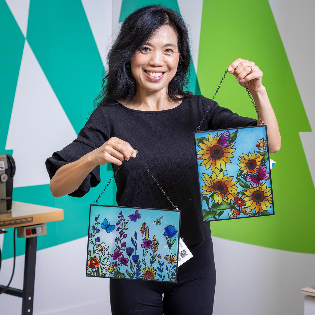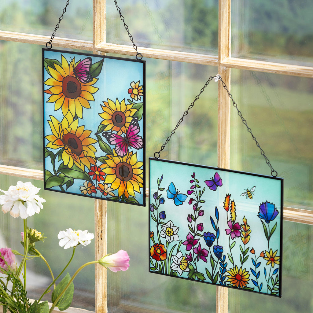 Enhance your living space with this beautiful Floral Stained Glass Wall Decor, showcasing vibrant garden flowers and butterflies. This piece adds a touch of nature to any room with its colorful stained glass design.