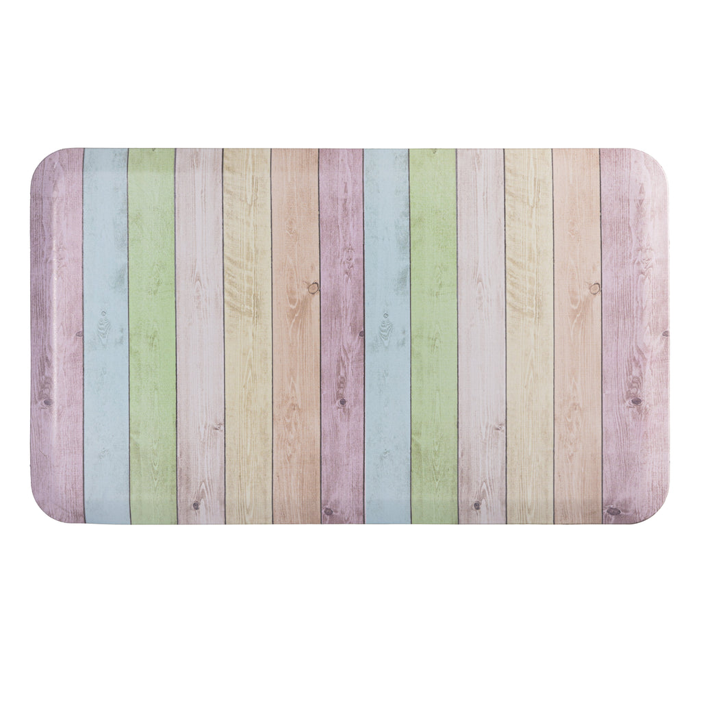 The Bunny Blooms Colorful Anti-Fatigue Kitchen Mat features a pastel wooden plank design, perfect for adding a touch of spring to any kitchen. Its anti-fatigue properties provide comfort during long periods of standing.