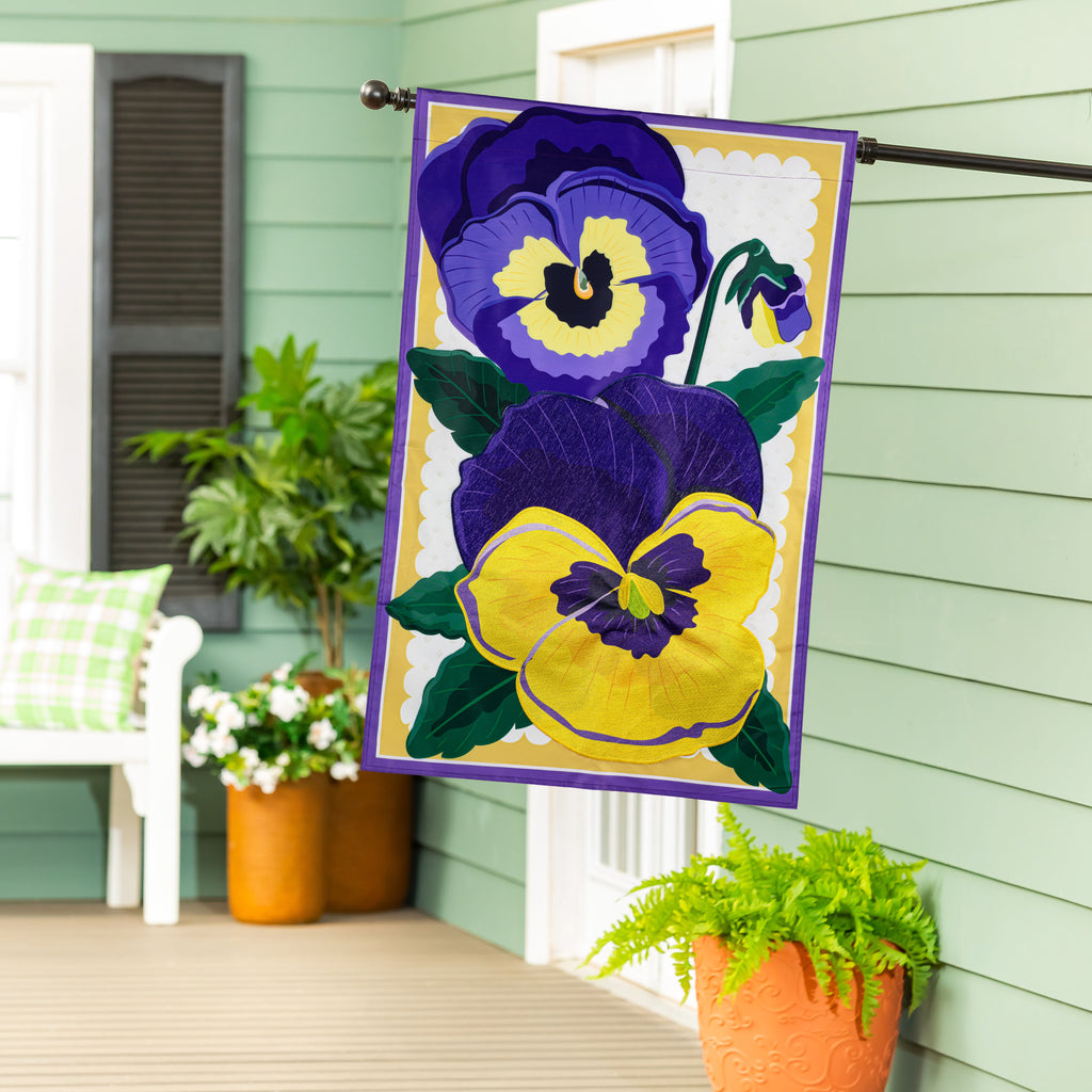 Brighten your home with the Vibrant Pansies Applique House Flag, showcasing intricate pansy designs in lively colors perfect for spring. This high-quality flag will add a touch of elegance and cheer to any outdoor space.
