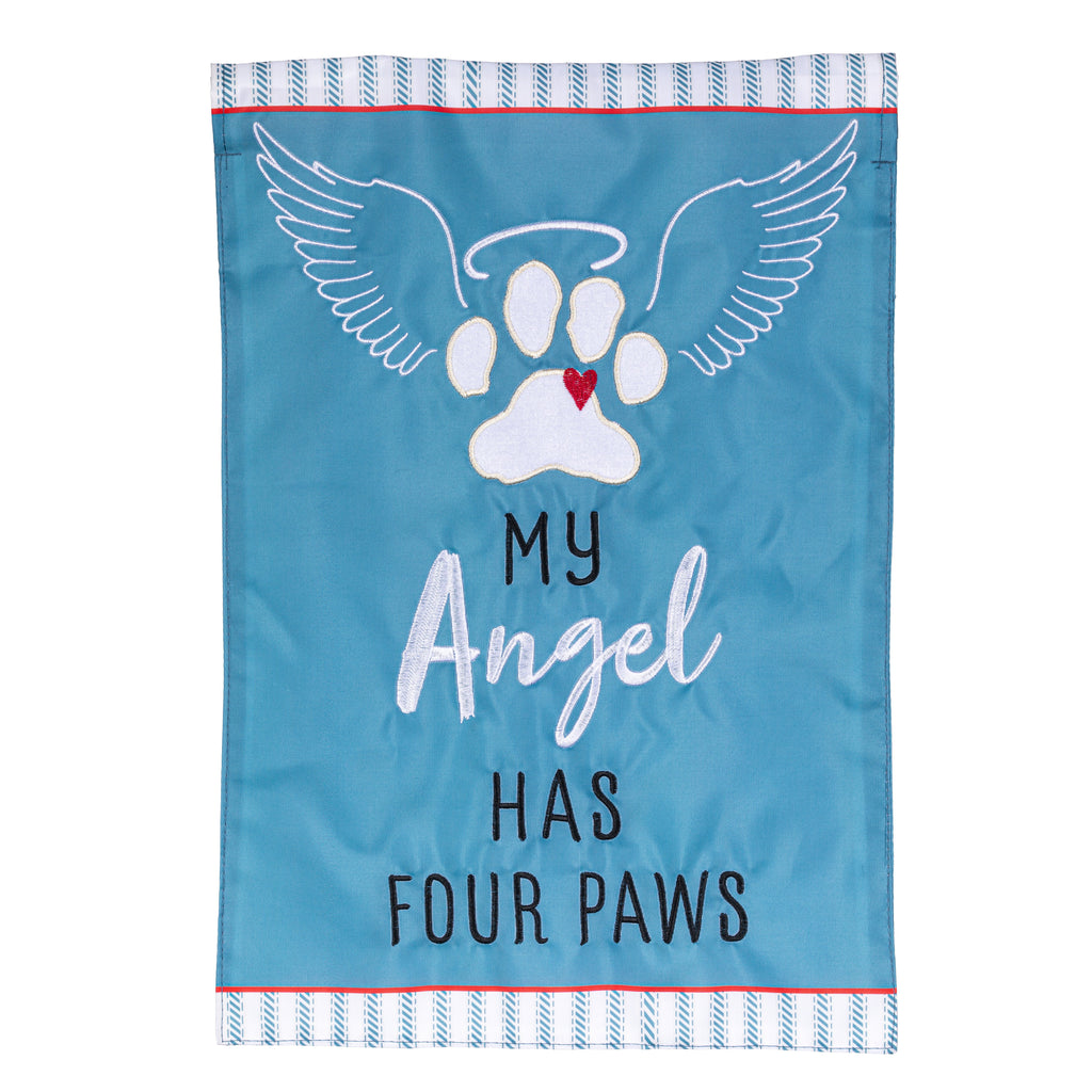 Celebrate your love for pets with the 'My Angel Has Four Paws' applique garden flag. This beautifully designed flag adds a personal touch to any outdoor space.