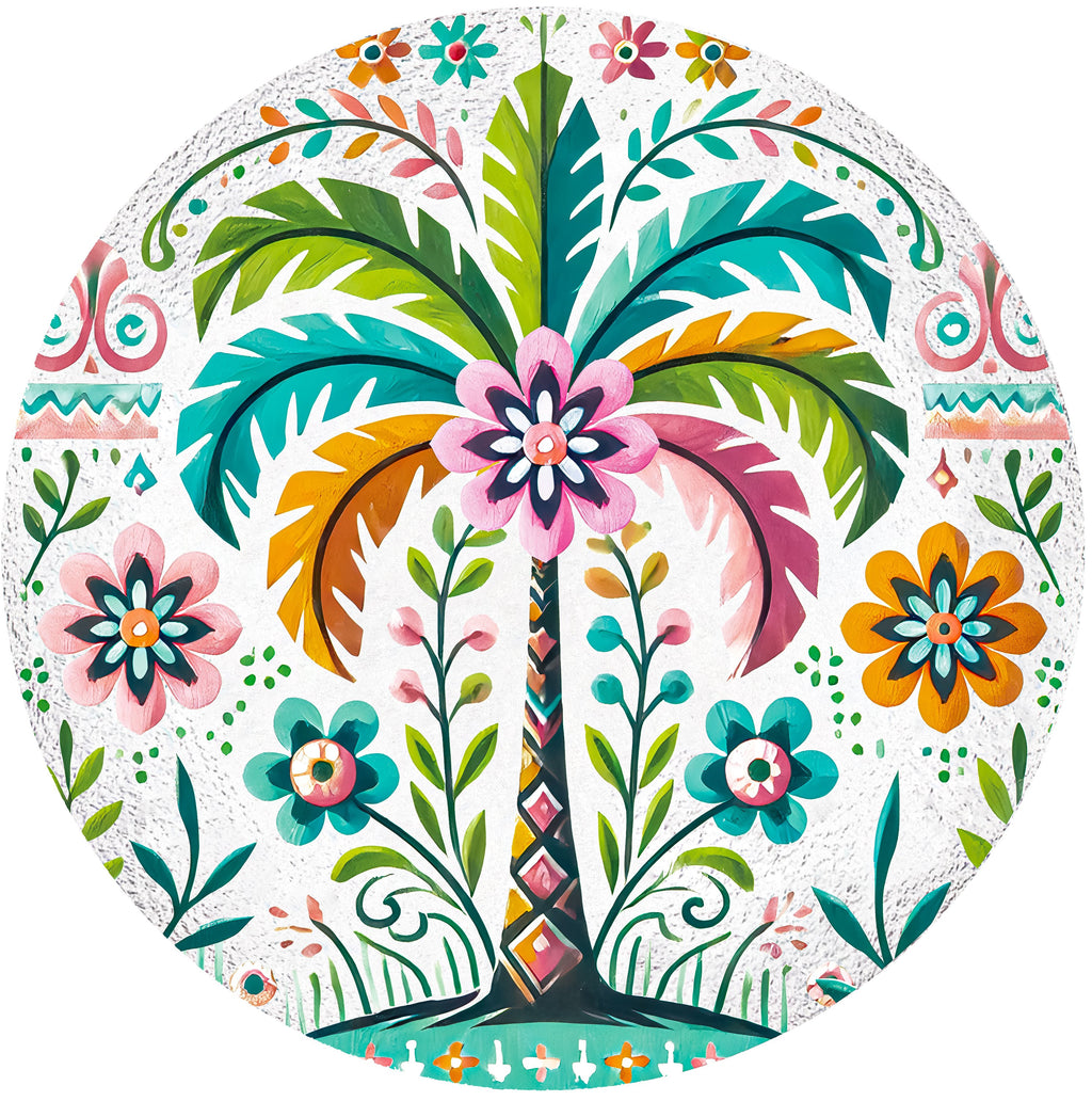 - Colorful folk art design with palm tree and floral elements.