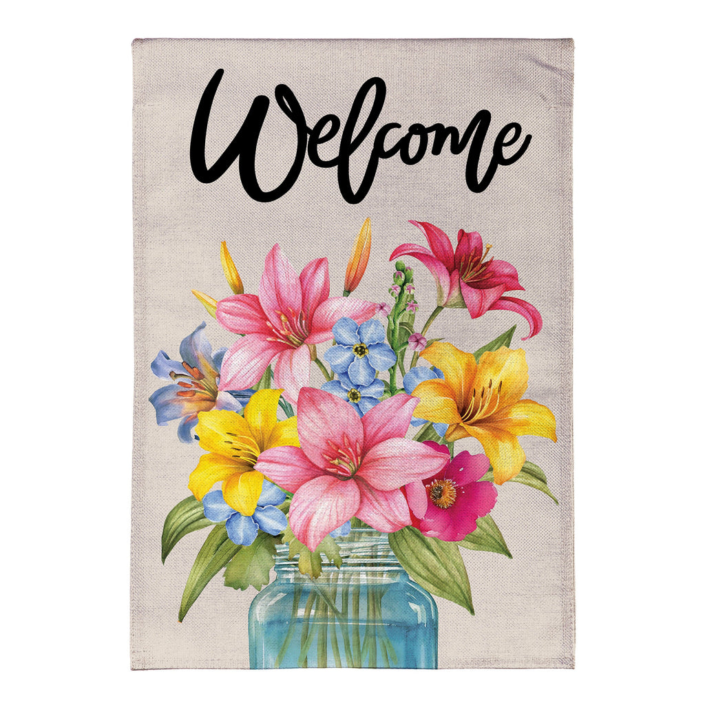Brighten up your home with the Floral Jar Welcome Burlap House Flag, perfect for adding a warm springtime touch to your outdoor decor. Featuring a vibrant bouquet in a jar design, this flag greets your guests with charm and style.