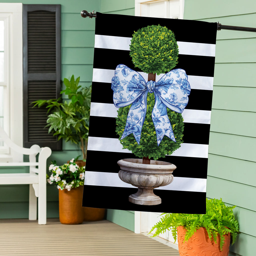 Enhance your outdoor decor with this charming Topiary With Bow Burlap House Flag. Perfect for spring, it features a topiary design with a striking blue bow against a black and white striped background.