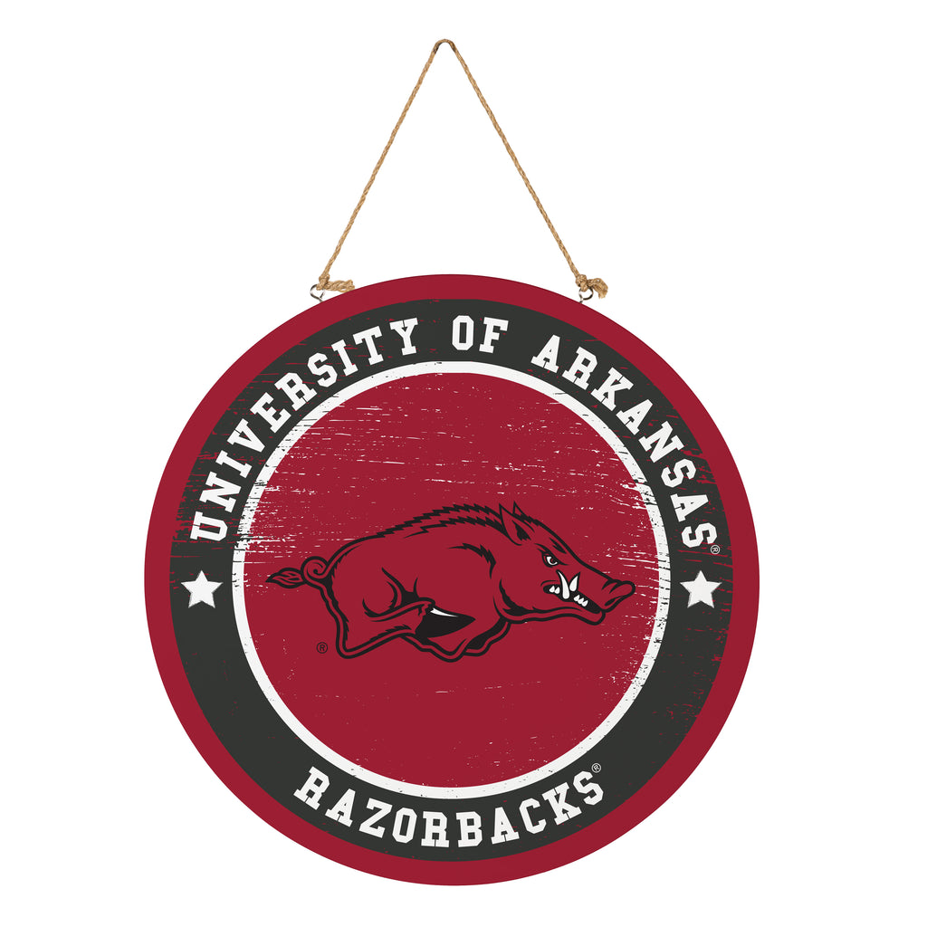 Celebrate your Razorbacks pride with this University of Arkansas Round Door Decor. Perfect for any fan, it features a durable hanging rope for easy display indoors or out.