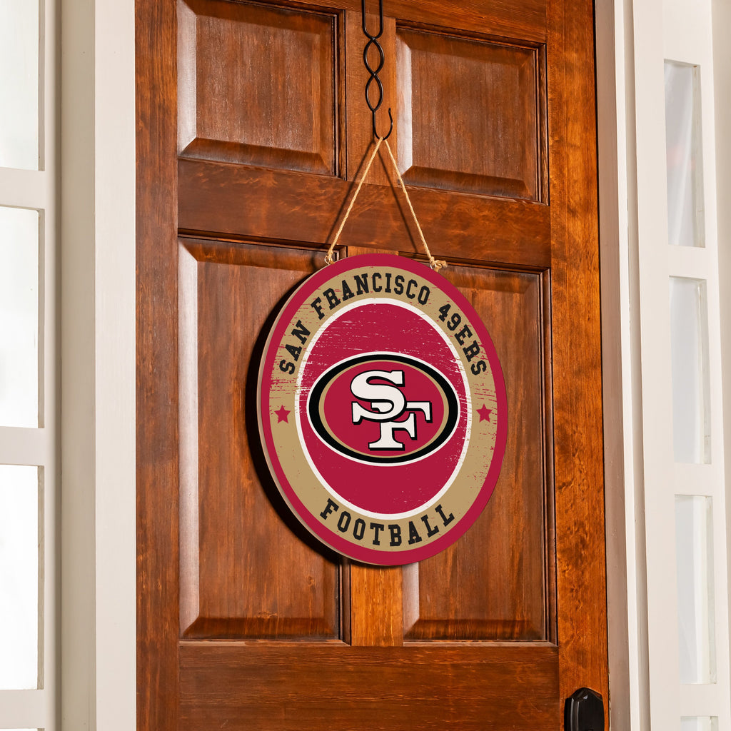 Show off your team pride with this San Francisco 49ers round door decor. Perfect for any fan, this piece features the team's colors and logo, making it a standout addition to your home.