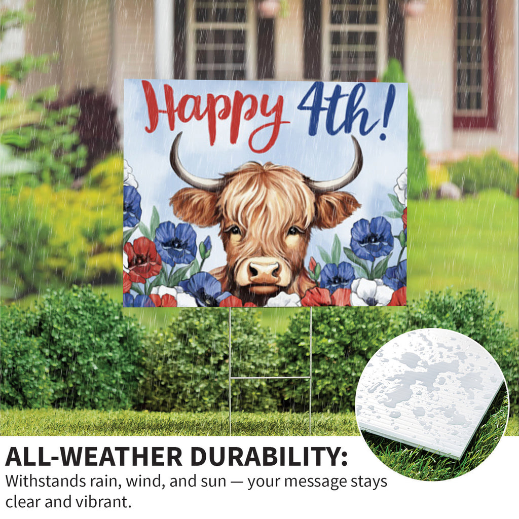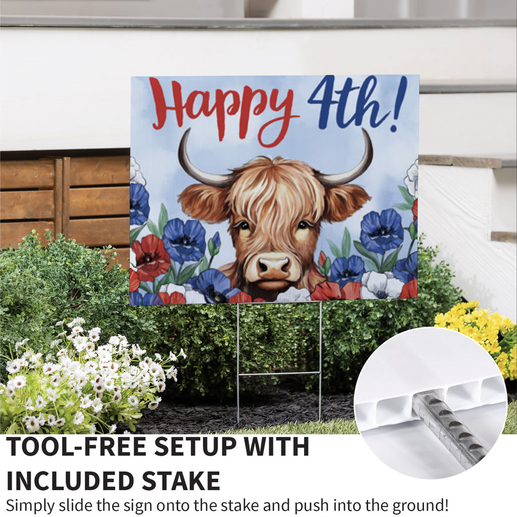 Celebrate Independence Day with this charming Highland Cow yard sign, featuring vibrant patriotic colors and a unique design. Perfect for adding a festive touch to your garden.