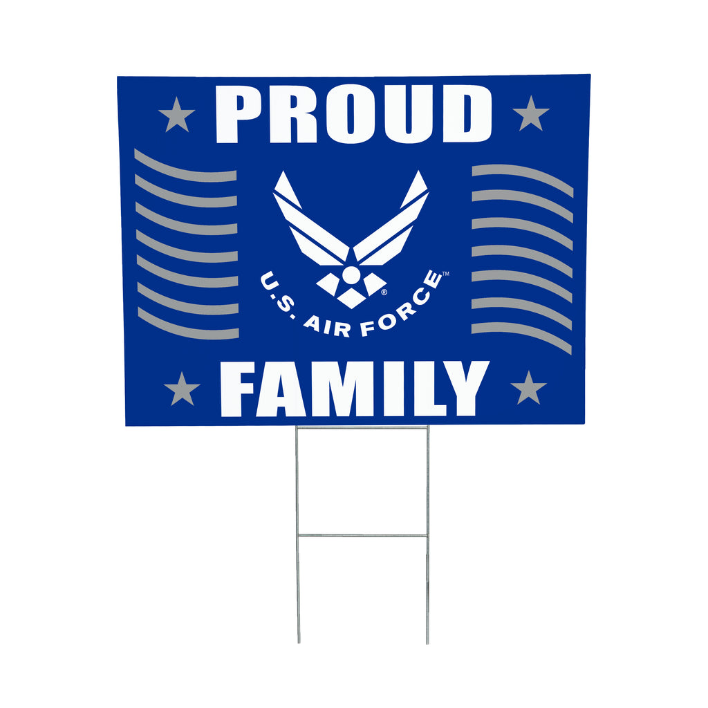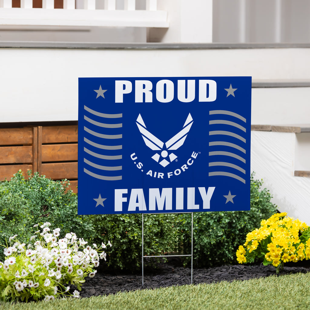 Showcase your pride for the U.S. Air Force with this vibrant 'Proud Family' yard sign, perfect for your garden or yard.