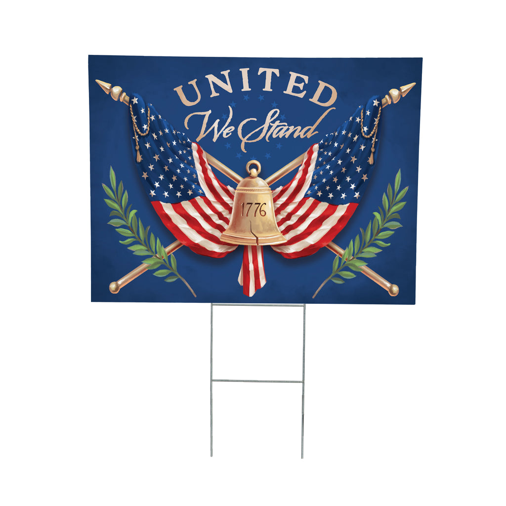 Show your patriotic spirit with this 'United We Stand' yard sign, featuring a bold design with American flags and the Liberty Bell.