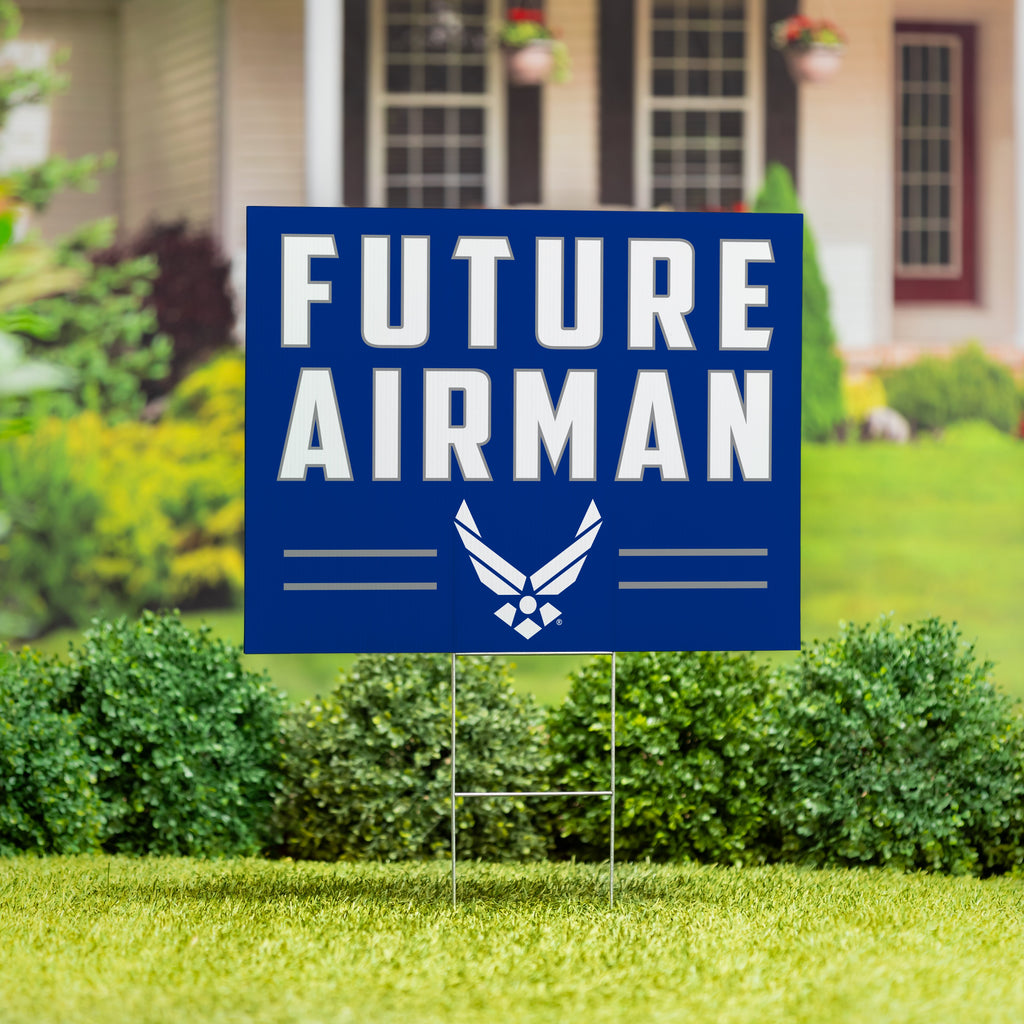 Show your support for the future of the USAF with this vibrant 'Future Airman' yard sign. Perfect for gardens and outdoor spaces, it's a bold statement piece for any patriotic home.