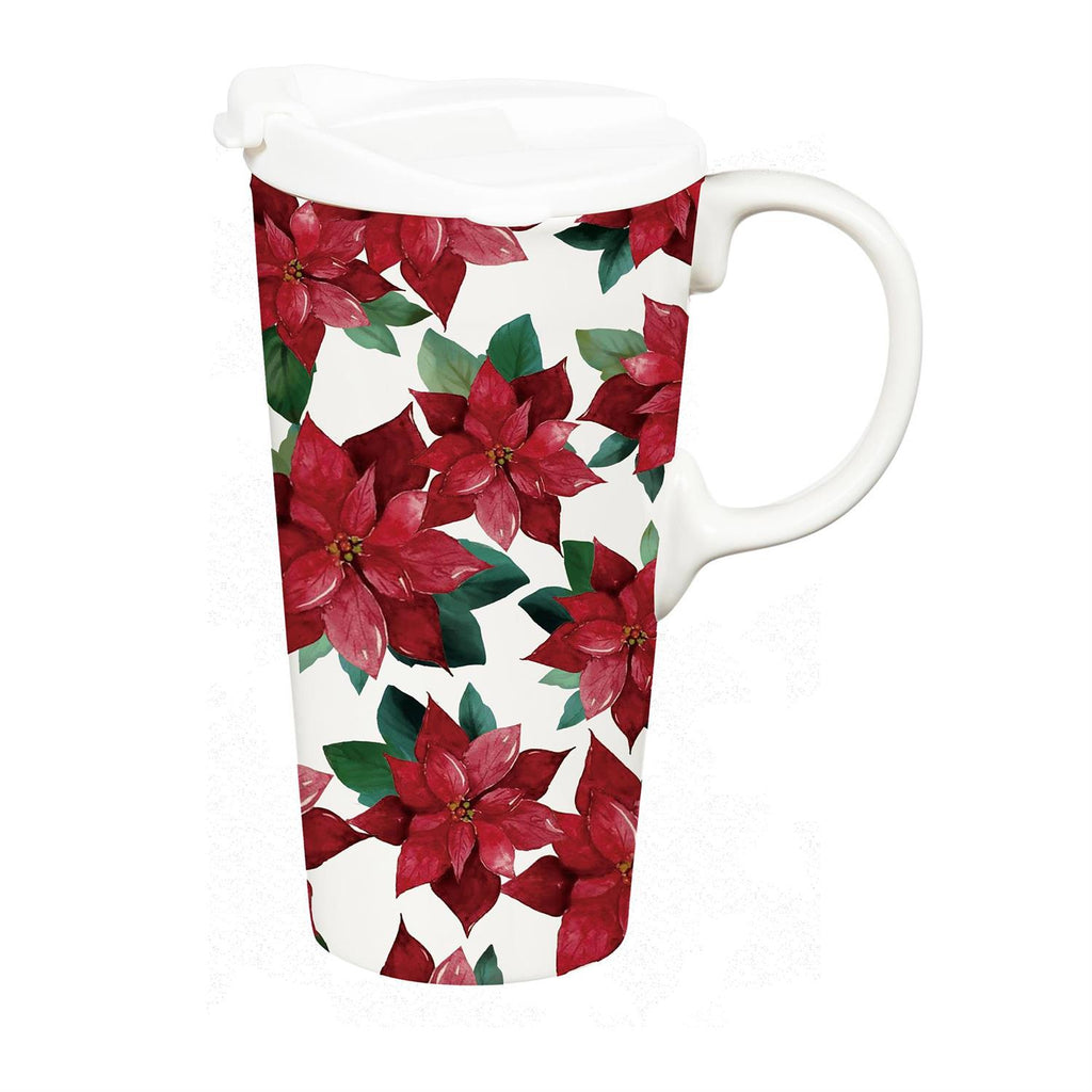 Holiday Poinsettia Travel Cup Ceramic Perfect Cup, Poinsettia Bliss, 17oz, Gift Box