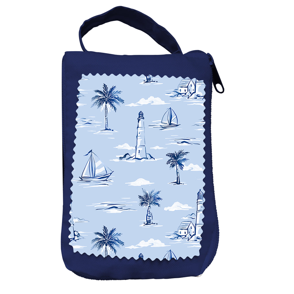 The Blue Coastal Tote is a stylish and compact folding bag, perfect for everyday use with a charming sailing-themed design.