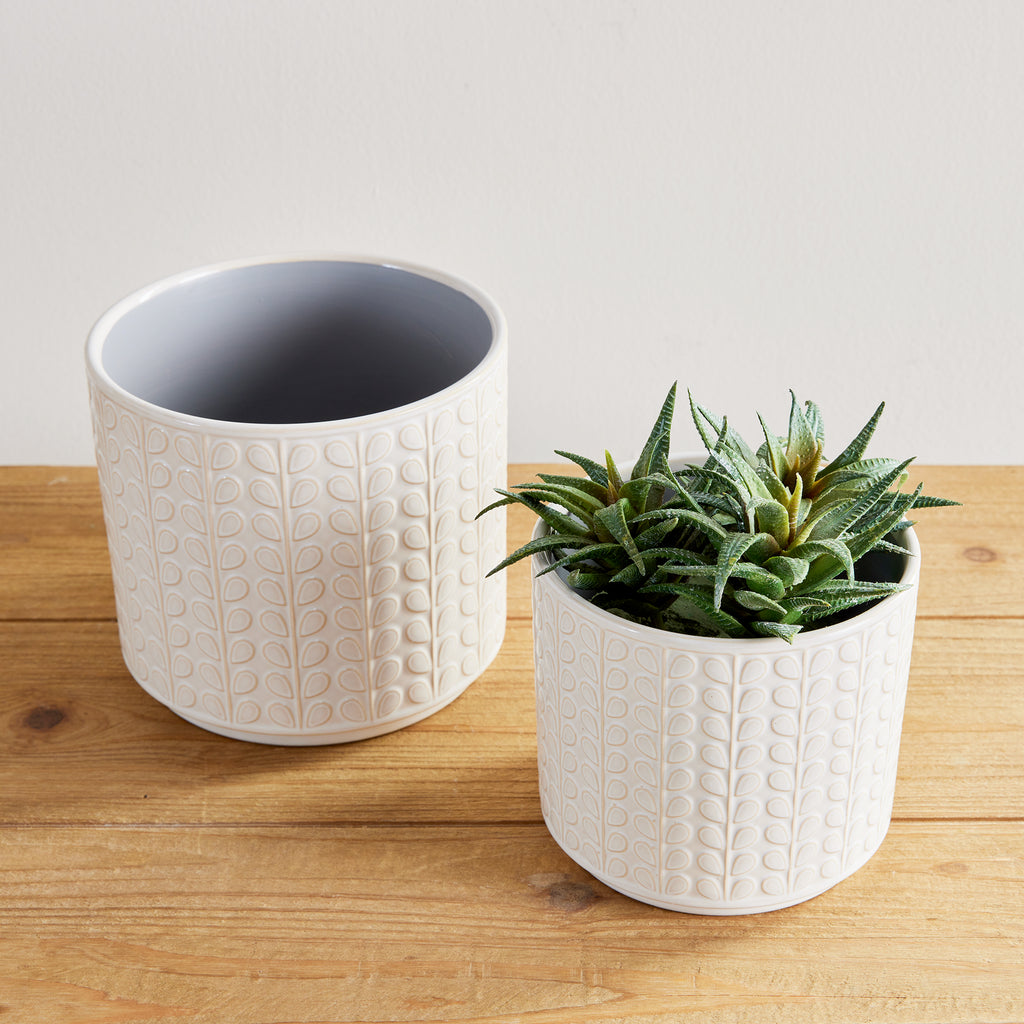 With a tight vine and leaf motif pattern, this set of pots adds a whole lot of charm. Fill with your favorite florals or greens and brighten any space.