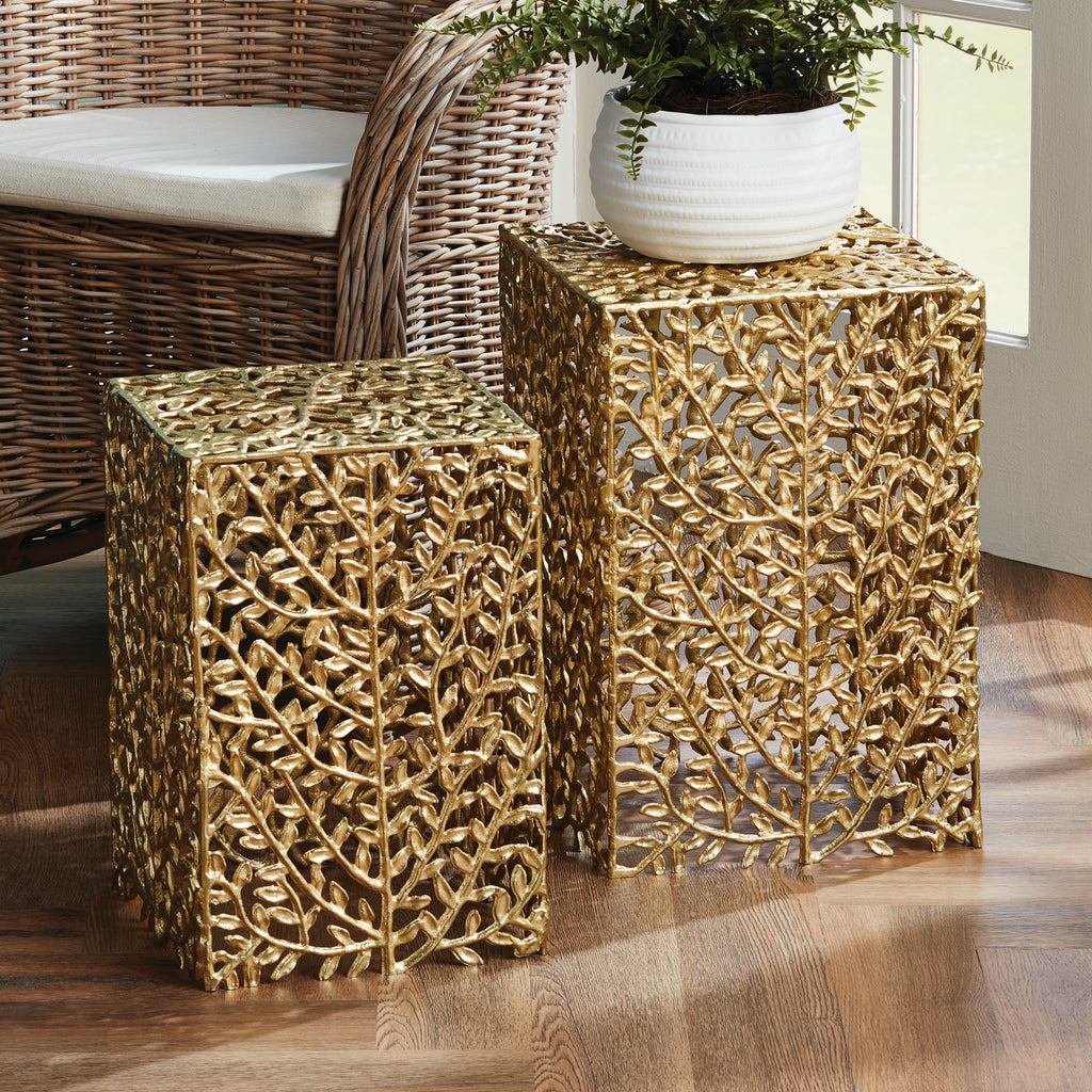 A whimsical flowing vine motif in aluminum frame makes up these exquisite side tables. Finished in a matte gold, they add a rich depth and texture to any space.