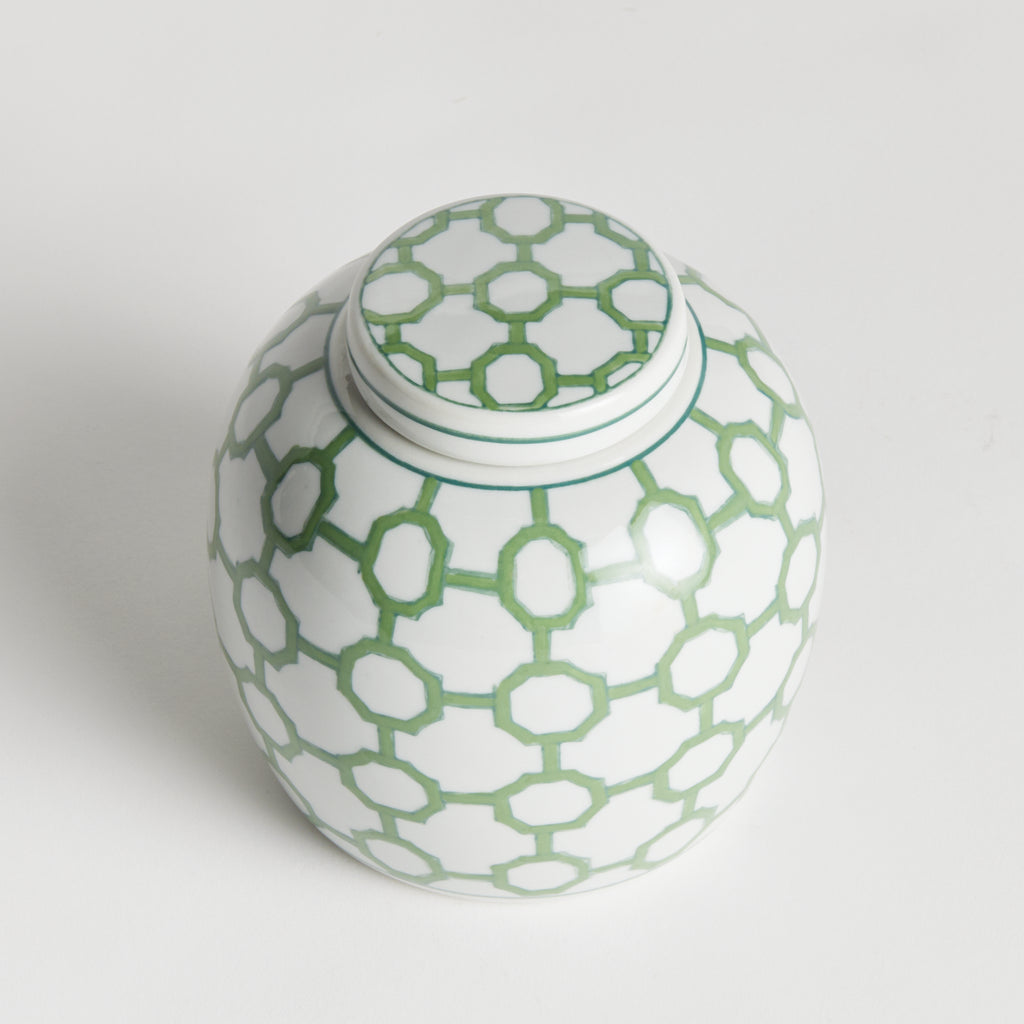 A classic chinoiserie in shades of green & white. How refreshing! The color green is known to have a harmonizing, balancing effect, and is an inspired design choice for this lidded jar. A welcome addition, adding stability and calm to the well-appointed bookshelf, mantel or entry console.