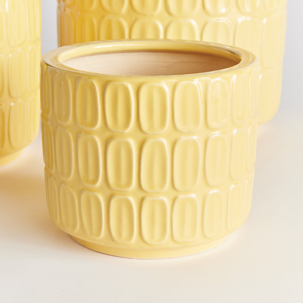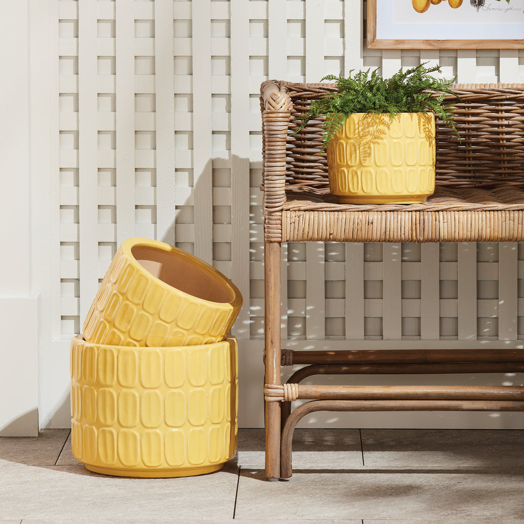 A high gloss glaze, stamped organic oval pattern and modern silhouette sets these pots apart from the rest. A bright marigold pop of color adds a cheerful, hand-finished touch to porch, patio or front steps.