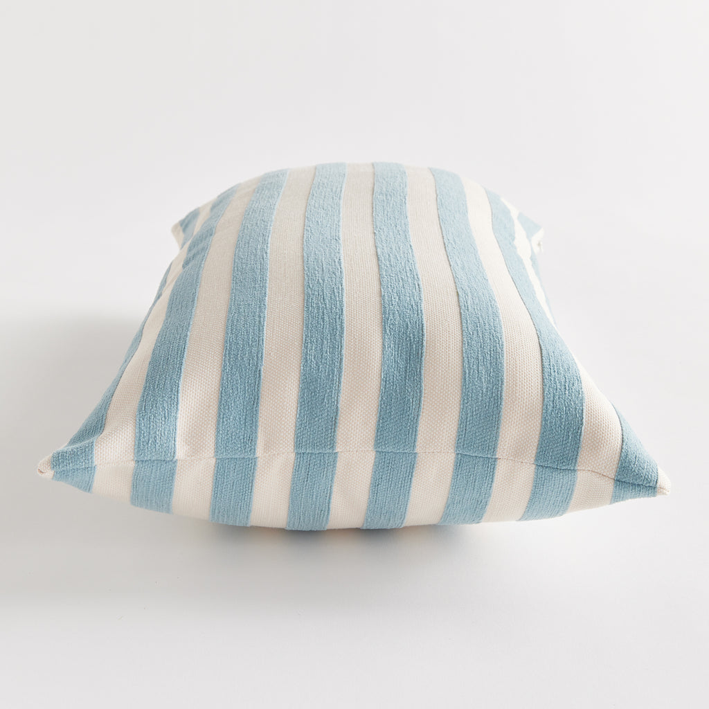 The indoor pillow that lives beautifully outdoors. Enjoy the upscale luxury and durability of Jacquard. With a modern pinstripe navy pattern, it adds a pop of rich color to any palette. This pillow is weather resistant and responsibly made. Filled with 100% recycled fibers.