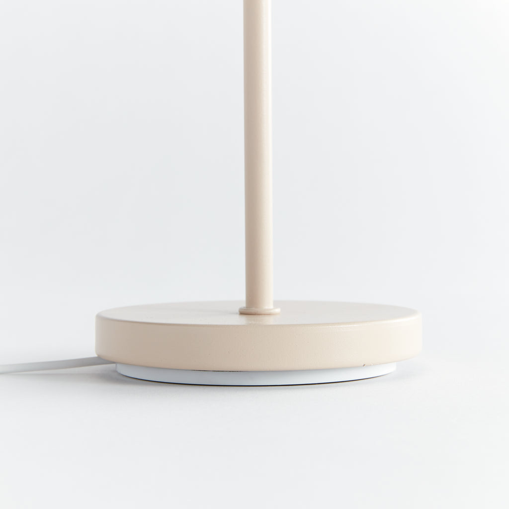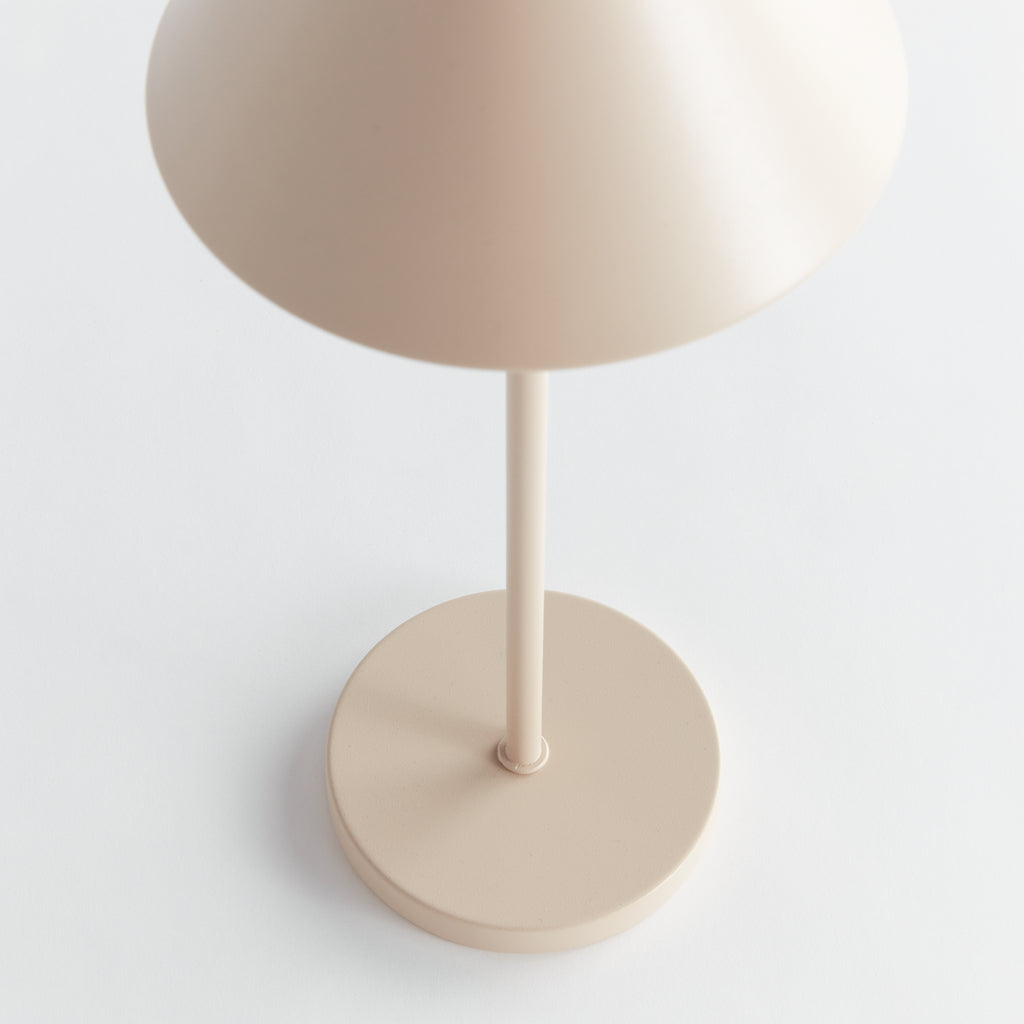 Sand;Easy touch On/Off and brightness settings: Candlelight (2200k), Warm White (2600k), Cool White (3000k);Light longevity at full charge: 10 hours at full light intensity;Total lumens: 200;Charge time: 6 hours;Charging station with USBA cord included;Shade material: metal;IP54 rated for damp conditions