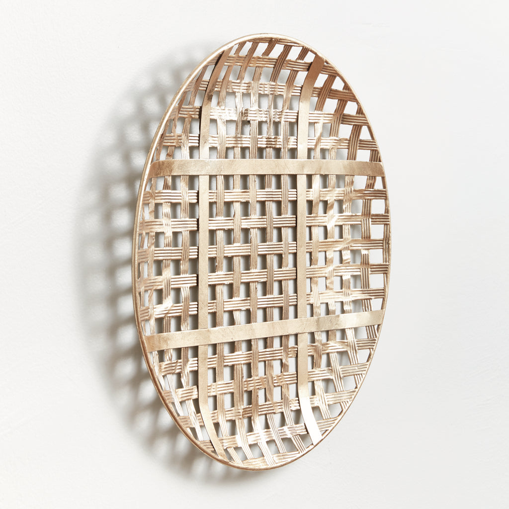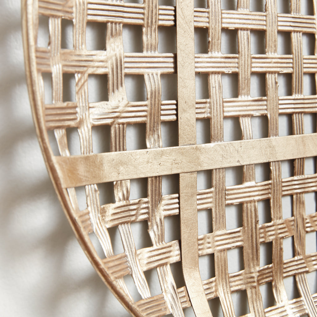 With a sloping edge and stamped iron texture, iron strands are woven together to create a dynamic wall feature. This well-scaled set of three are finished in a warm champagne. A stunning set for the modern home.