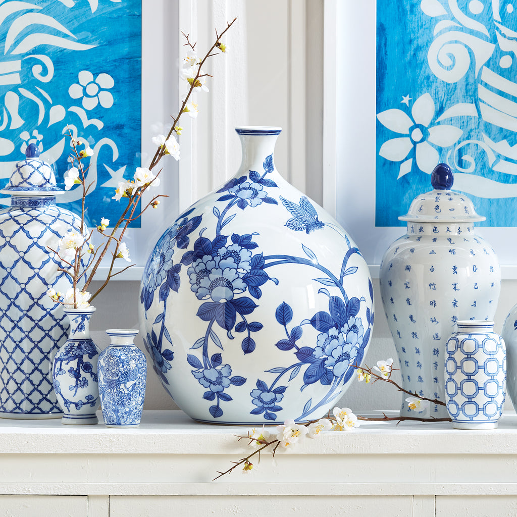 In a more contemporary spin on the traditional Chinese porcelain pattern, this modern take of a traditional vase is a feminine, graphic interpretation. A unique piece of porcelain by iconic lifestyle & interior designer Barclay Butera