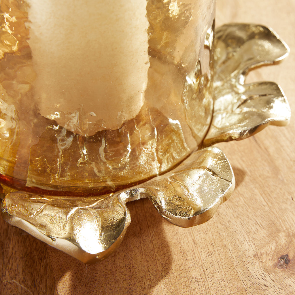 With an ombre hammered glass hurricane in a warm amber tone, atop a cast-aluminum flowering petal tray, this is a signature accent piece for the home. Simply add a flickering candle and enjoy the warm glow.