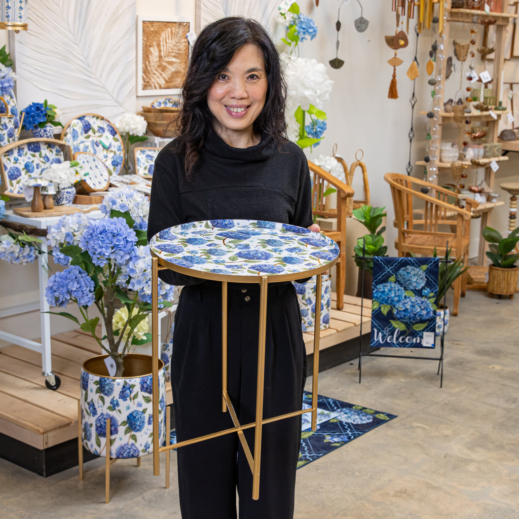 VivaStyle Outdoor Side Table, Printed Metal Side Table, Hydrangea, 19"H