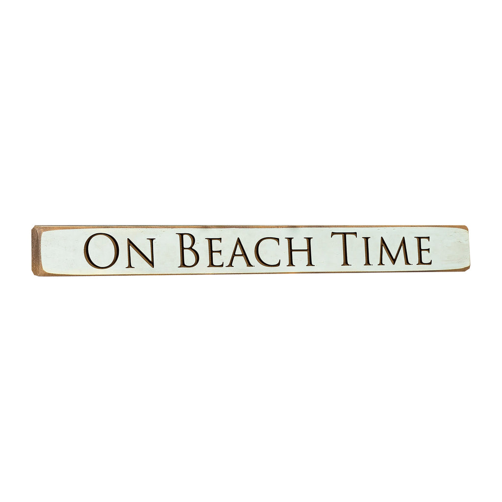 Bring a coastal vibe to your home with this 18-inch wood tabletop sign, featuring 'On Beach Time' in a stylish font.