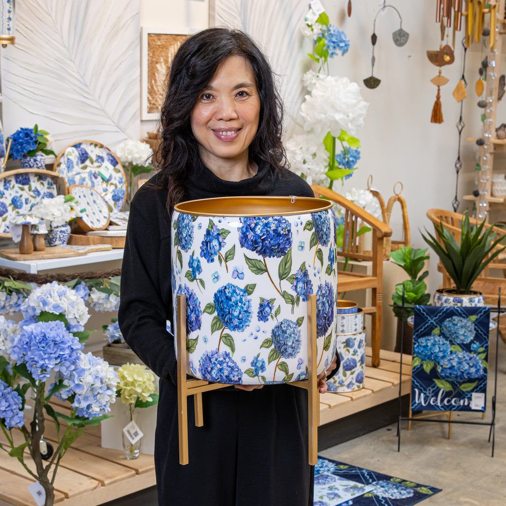 VivaStyle Planter, Printed Metal Planter with Legs, Hydrangea, 18.7"H