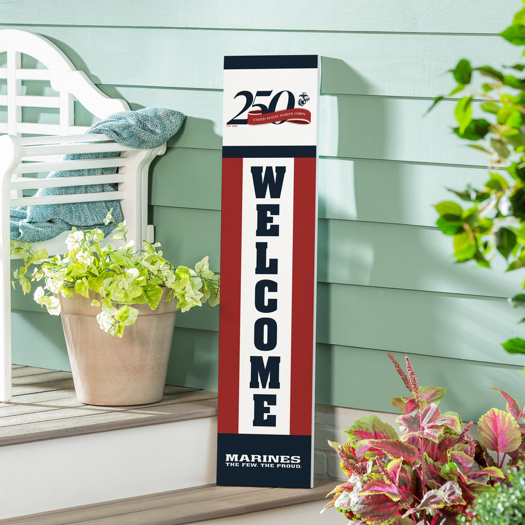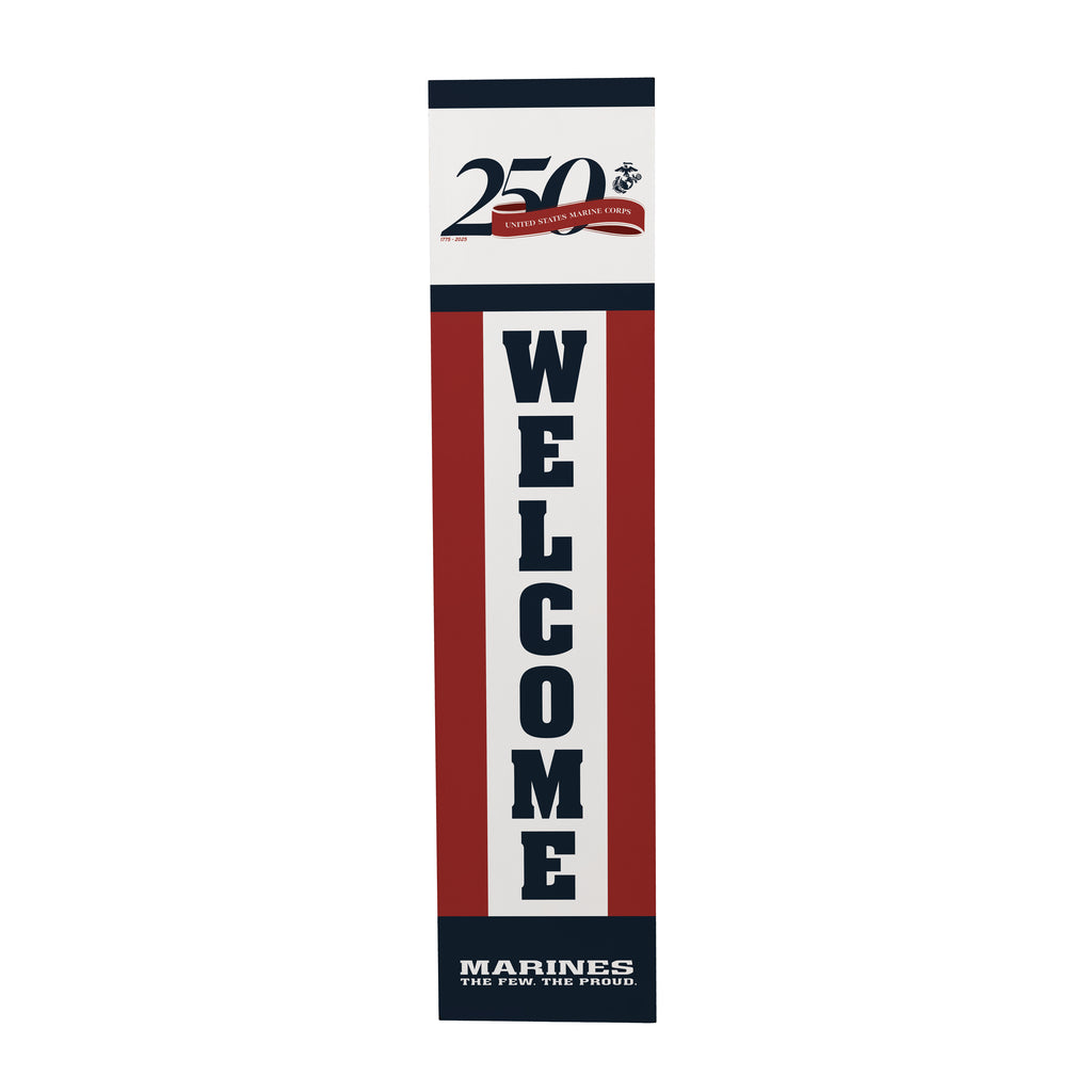 Celebrate the 250th Anniversary of the US Marine Corps with this striking porch leaner, perfect for any outdoor space. Featuring bold 'Welcome' lettering, this leaner is a tribute to the proud tradition of the Marines.