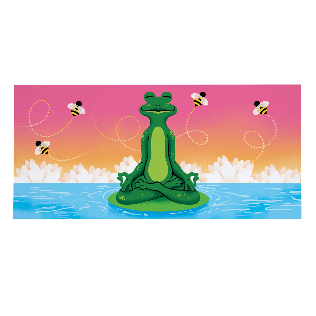 The Meditating Summer Frog Sassafras Switch Mat features a serene frog design, perfect for adding a whimsical touch to your outdoor space. Its vibrant colors and playful bees make it ideal for spring and summer settings.