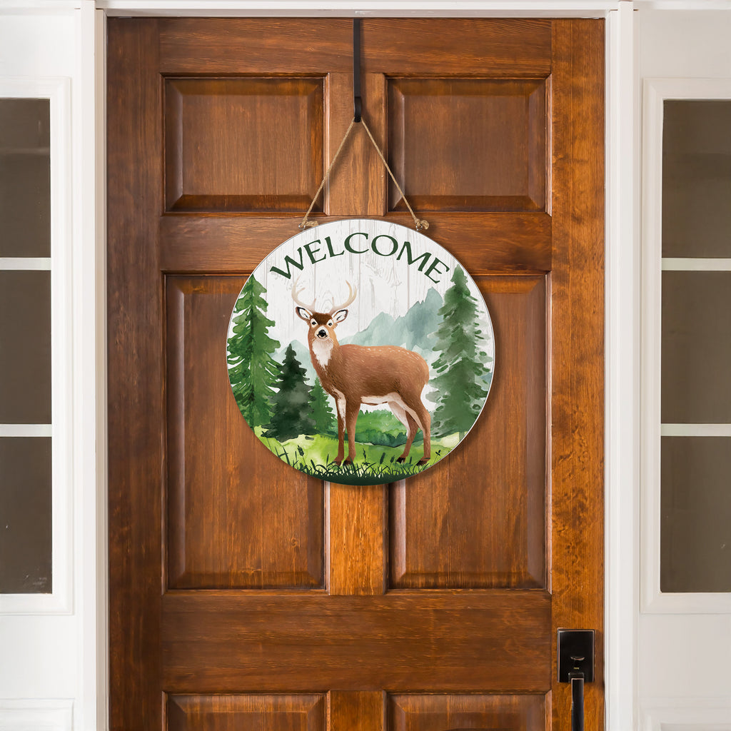 Enhance your entryway with the High Country Wilderness Wood Door Decor, featuring a majestic deer against a forest backdrop. Perfect for adding a touch of nature to your home.