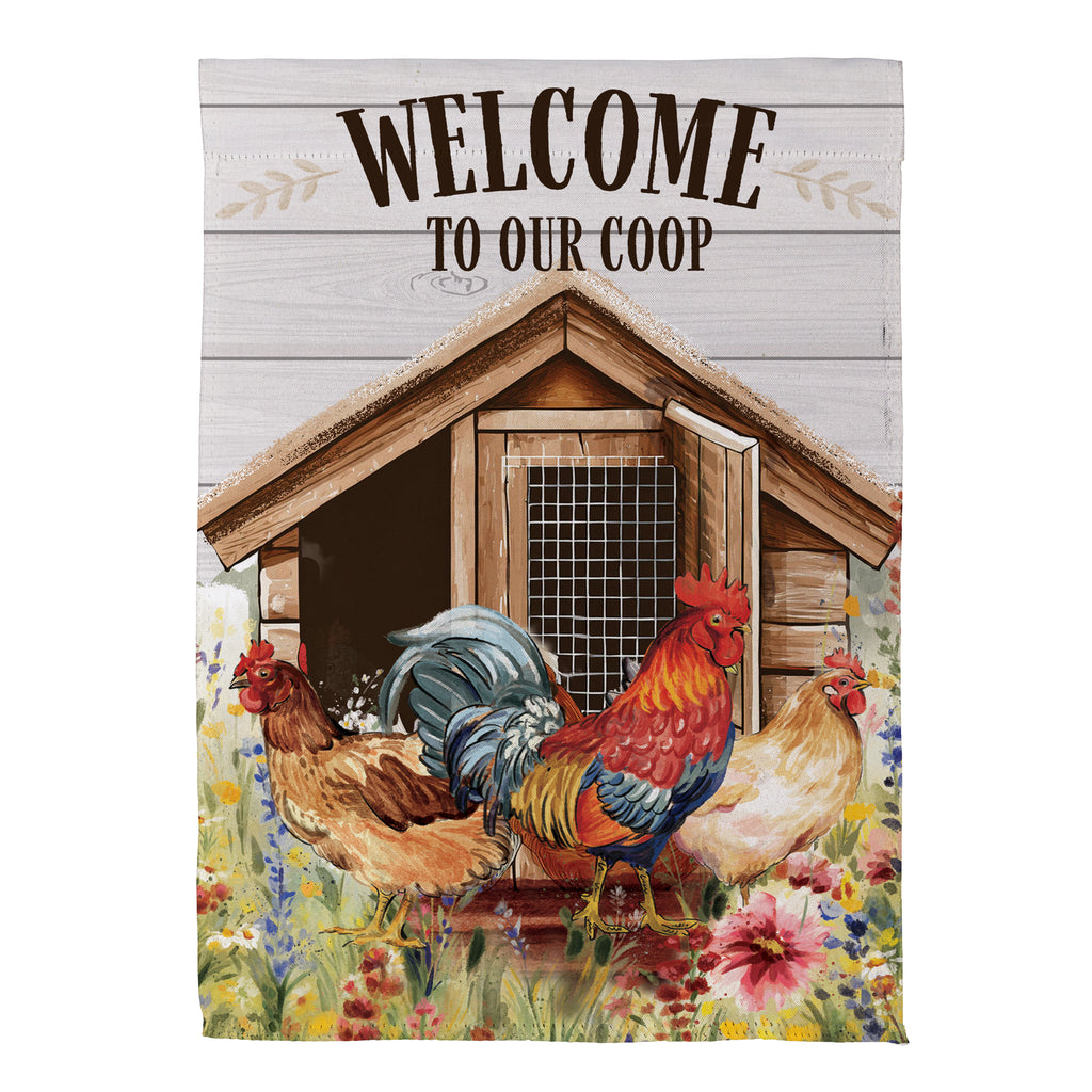 Welcome guests with the Petal & Plow Coop Suede House Flag, featuring vibrant roosters and a rustic coop design. Perfect for adding charm to any outdoor space.