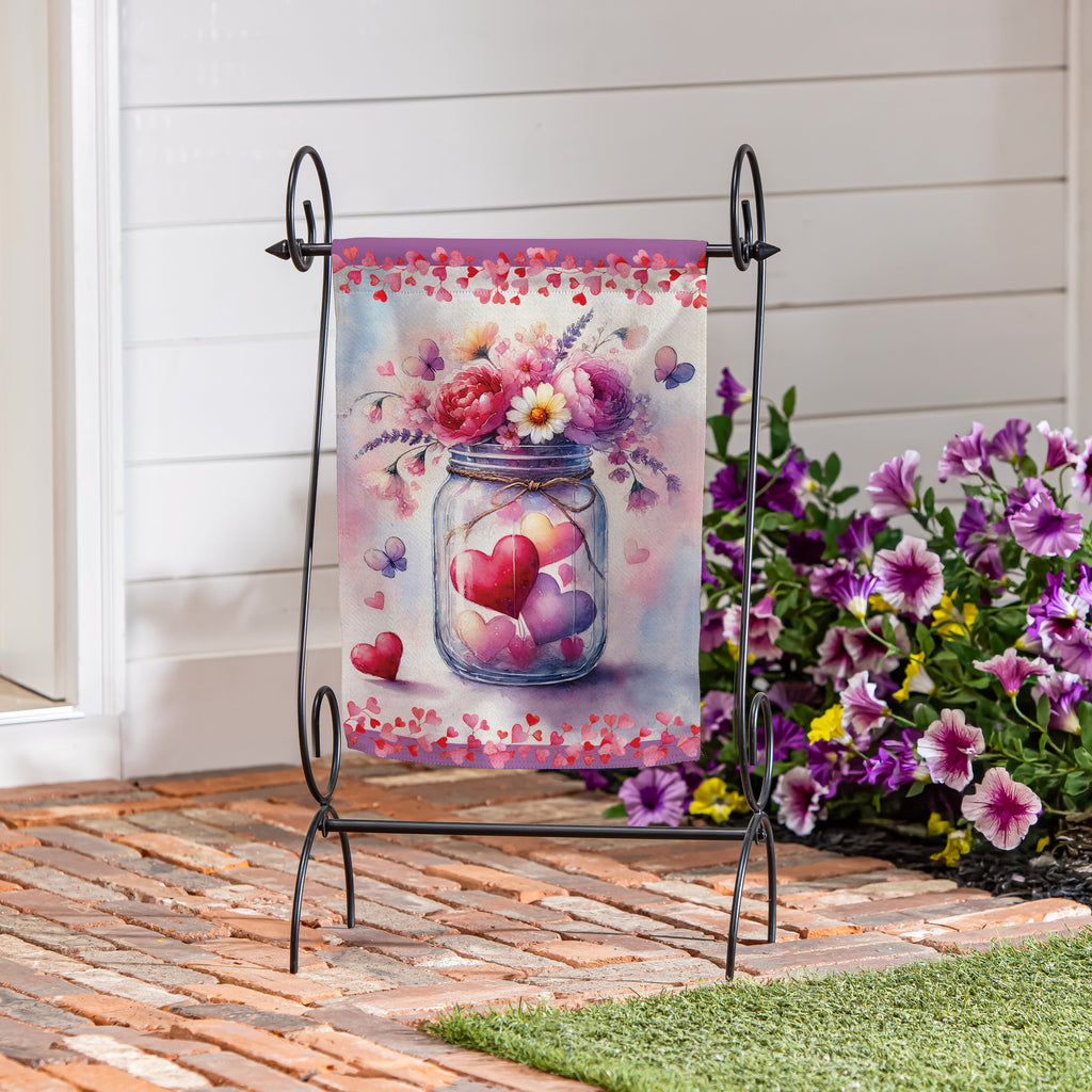 Celebrate the beauty of spring with the Jar Of Hearts Suede Garden Flag, featuring a charming design of hearts and flowers in a mason jar. Perfect for adding a touch of love and color to your garden.
