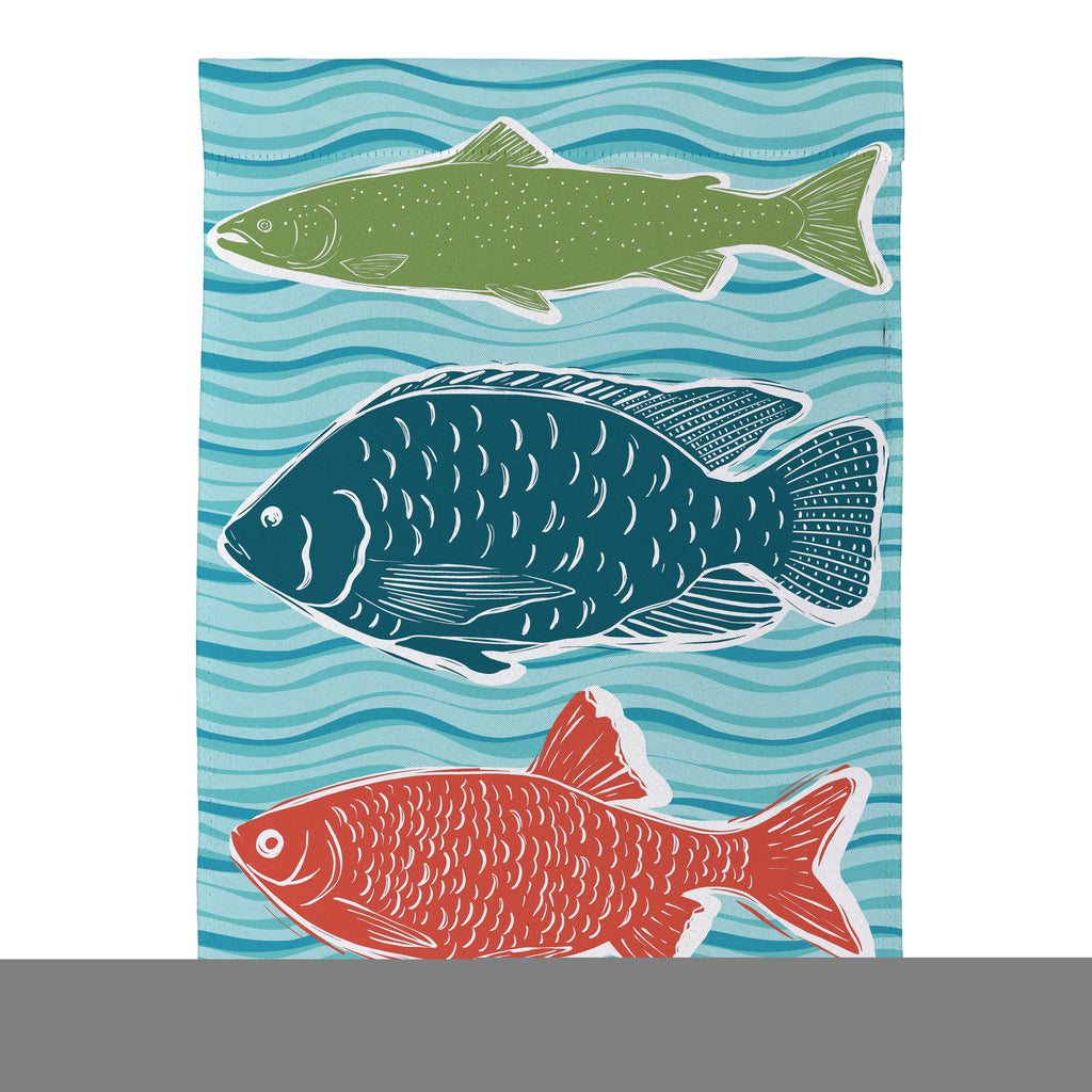 The Wave Of Fish Suede House Flag features a vibrant design with three colorful fish set against a wavy blue background, perfect for adding a touch of whimsy to your home decor.