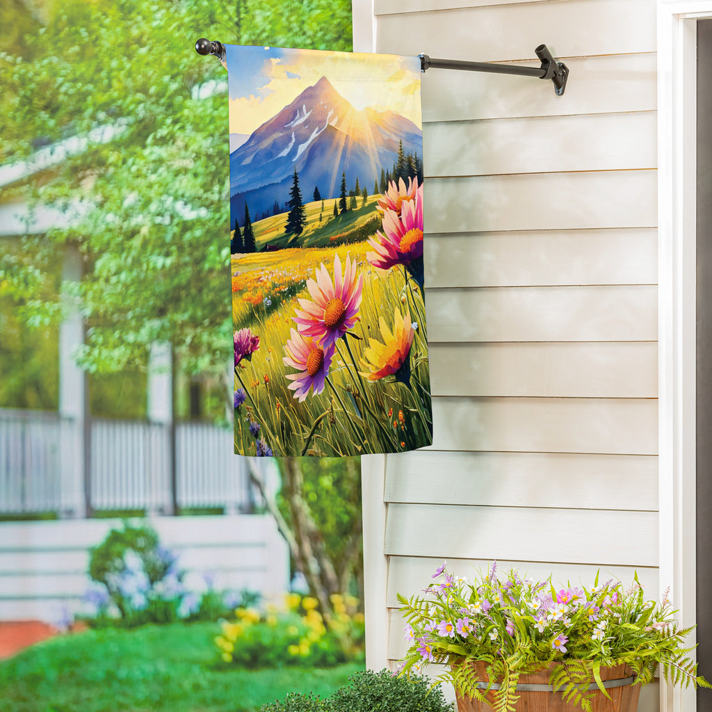Enhance your home's exterior with the Amazing View Suede House Flag, featuring vibrant spring florals set against a stunning mountain backdrop.