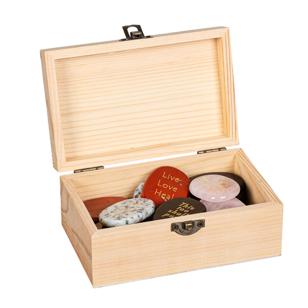 This Engraved Wish Stone Token set features 24 unique stones in a decorative wooden box, perfect for gifting or personal inspiration. Each stone bears a thoughtful engraving, making them ideal for conveying meaningful messages.