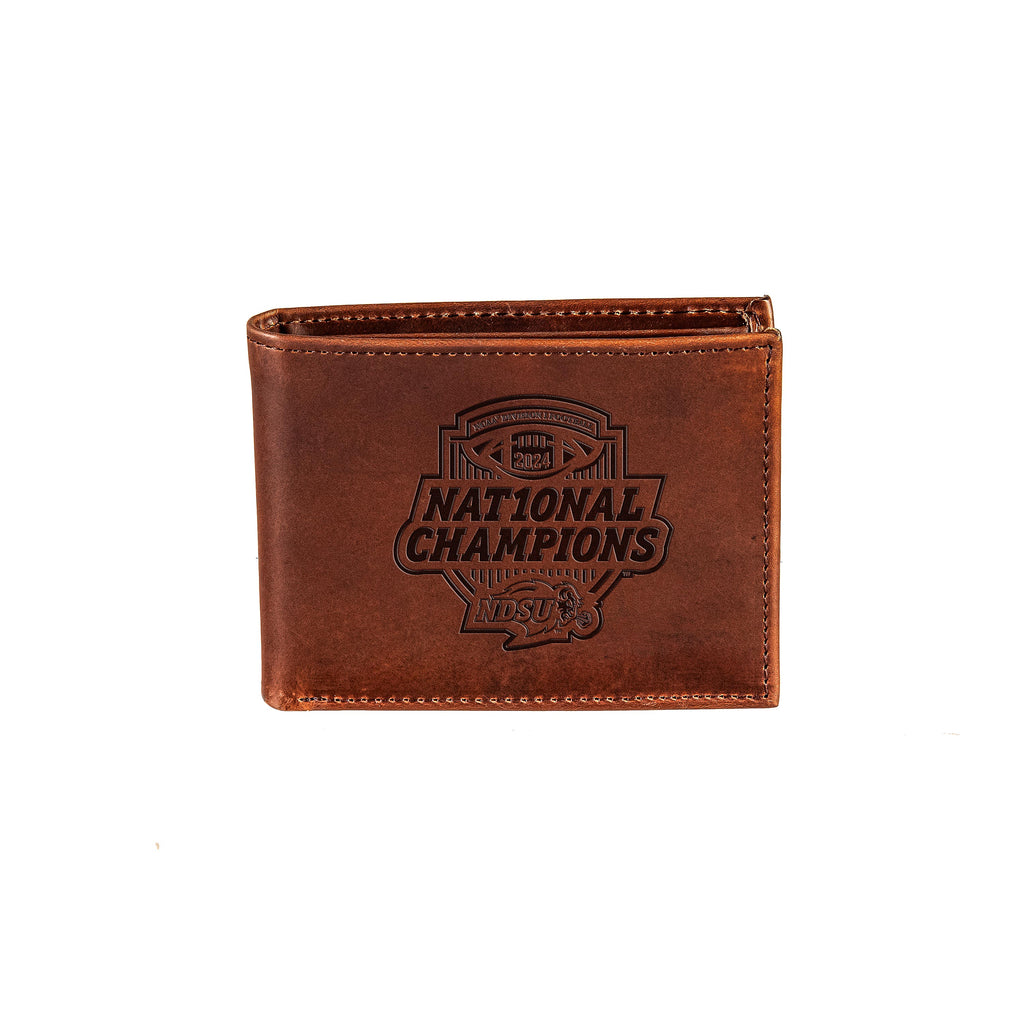 Celebrate your favorite team's victory with the North Dakota State University FCS Champions bi-fold wallet. This brown wallet features an embossed design, ideal for showing school pride.