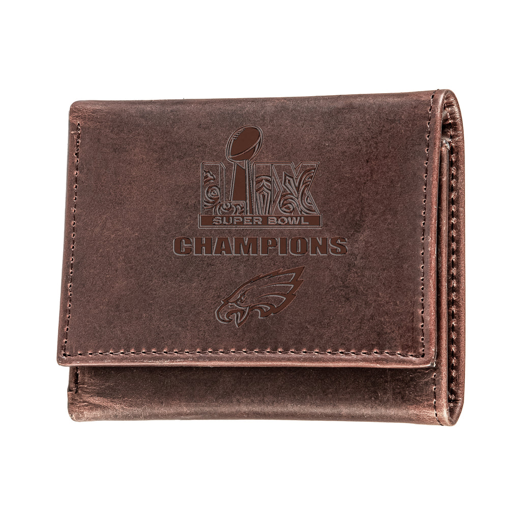 Celebrate the Philadelphia Eagles' victory with this Super Bowl 59 Champions tri-fold wallet, featuring a stylish brown leather design.
