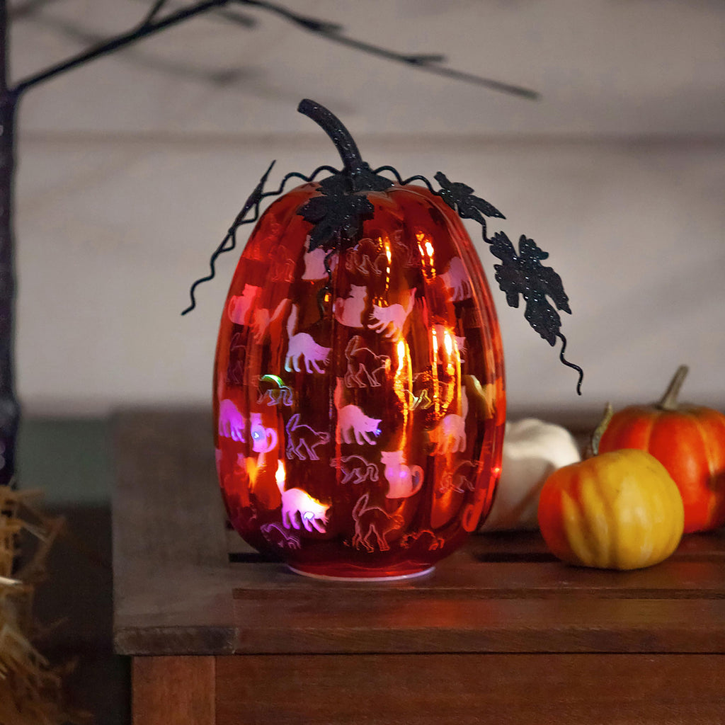 Illuminate your Halloween decor with this enchanting LED Glass Pumpkin, featuring a whimsical cat design. Perfect for adding a festive glow to any room.